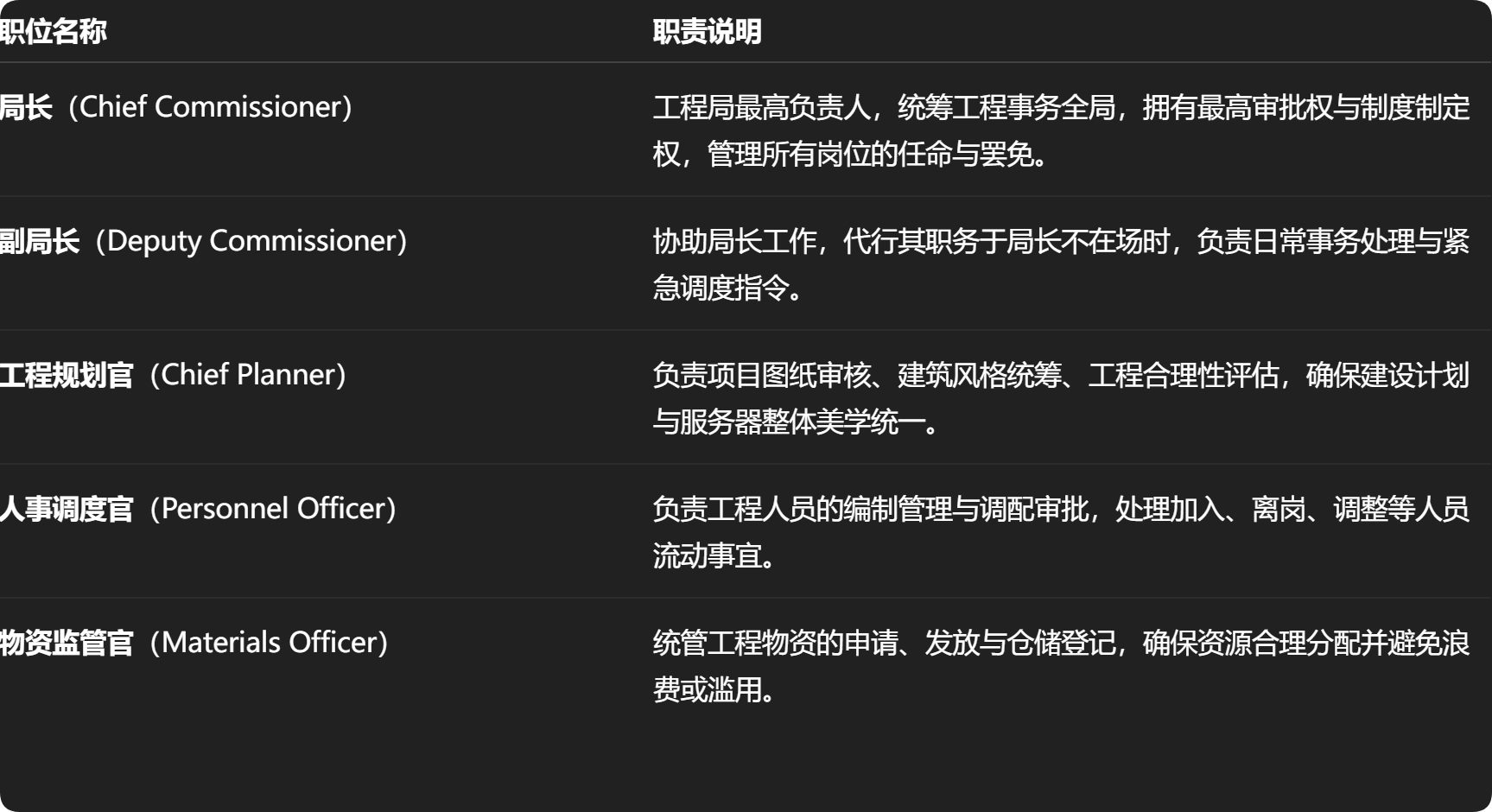 玩家提交申请 → 工程建设管理局详细审核 → 局长会签 → 镇长终审 → 批准开工。