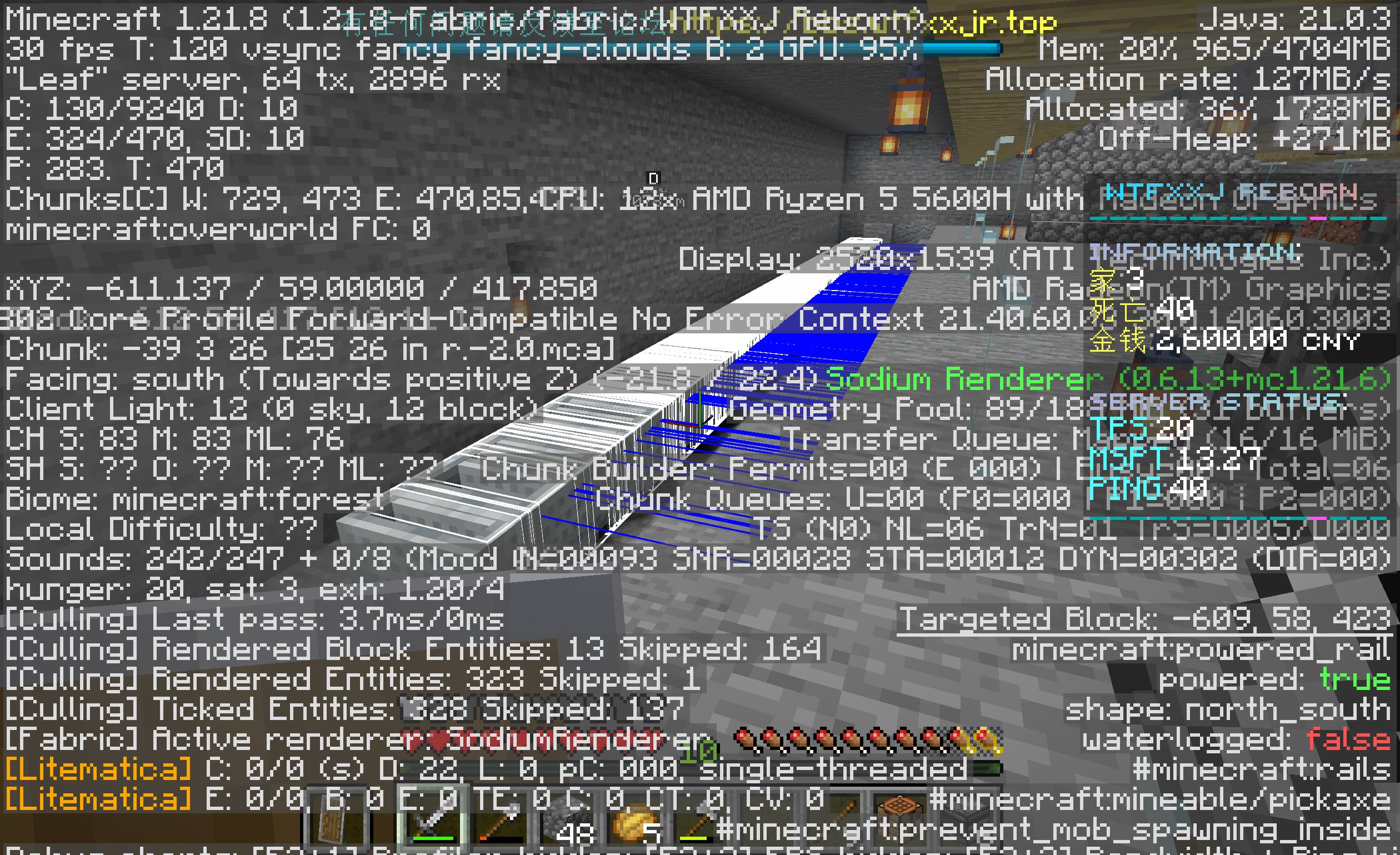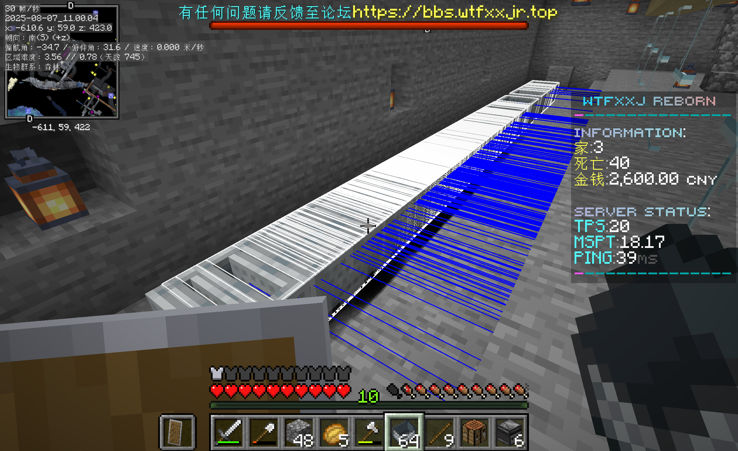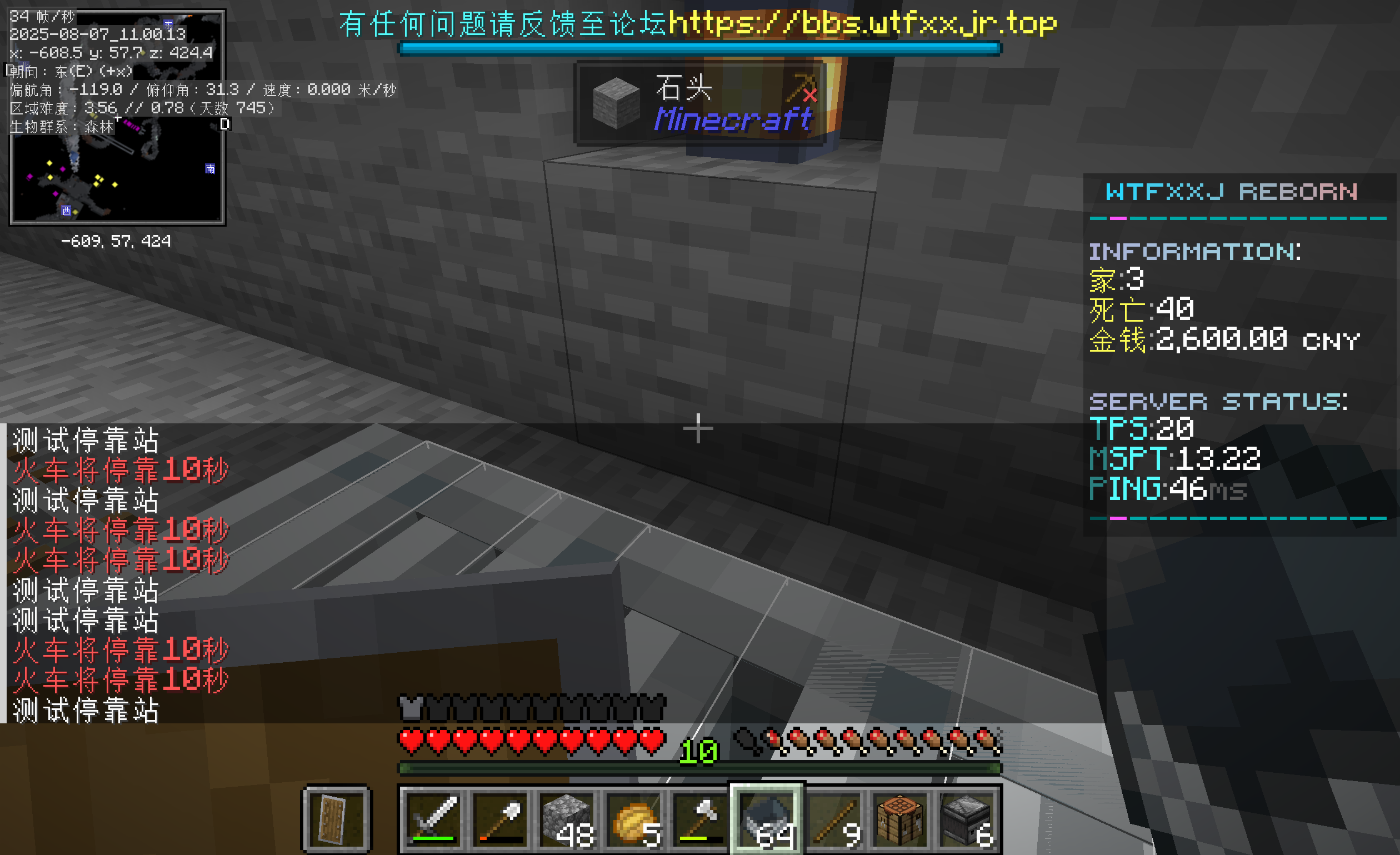 谁那么无聊,在铁路上放了300多辆矿车,我说这刷铁机里怎么没铁了。还有我发现矿车物品可堆叠(看我第二张图的物品栏),最后这个测试停靠站火车将停靠10秒是怎么回事: